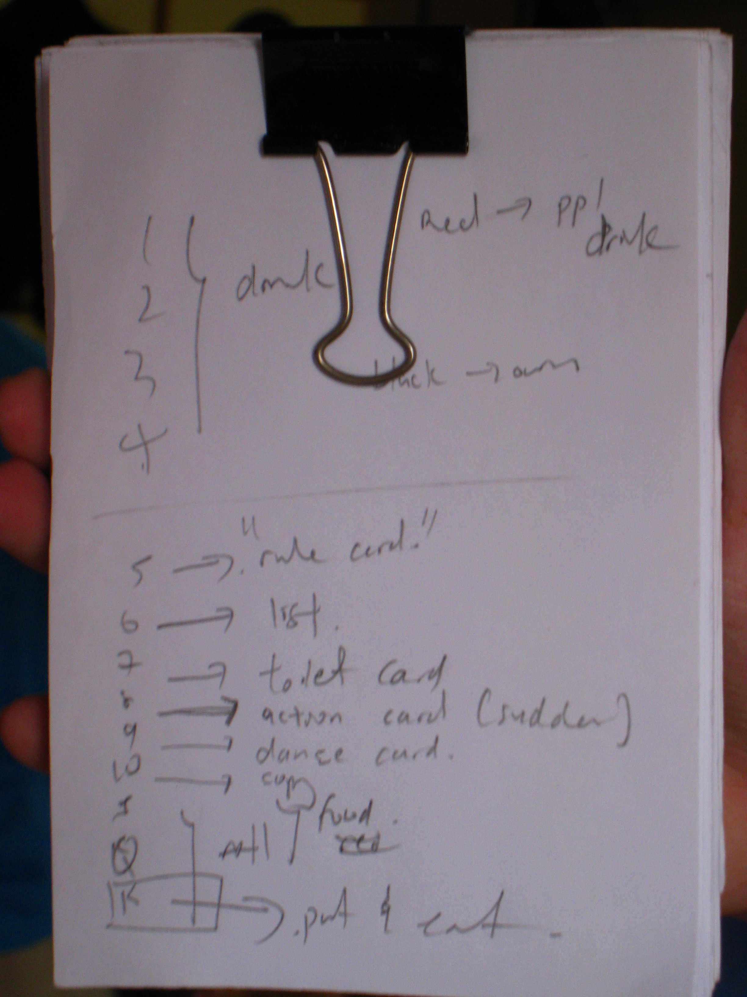 5: rule card. the person sets a rule, any rule. for example, every time Alice drinks, Barry also has to drink.